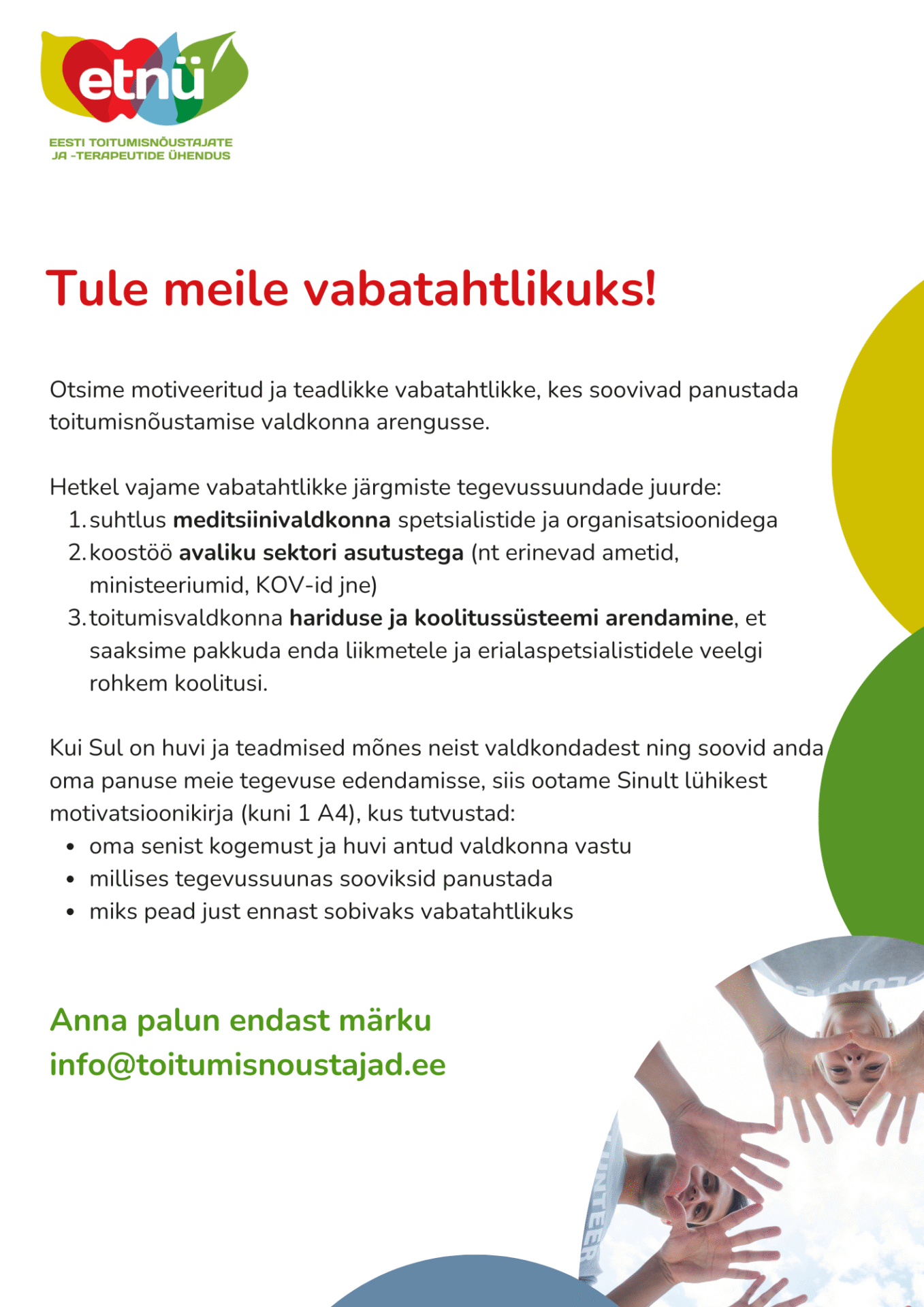 Eesti Toitumisnõustajate ja -terapeutide Ühendus (ETNÜ) otsib vabatahtlikke, kelle abil saaksime enda eesmärke ellu viia.